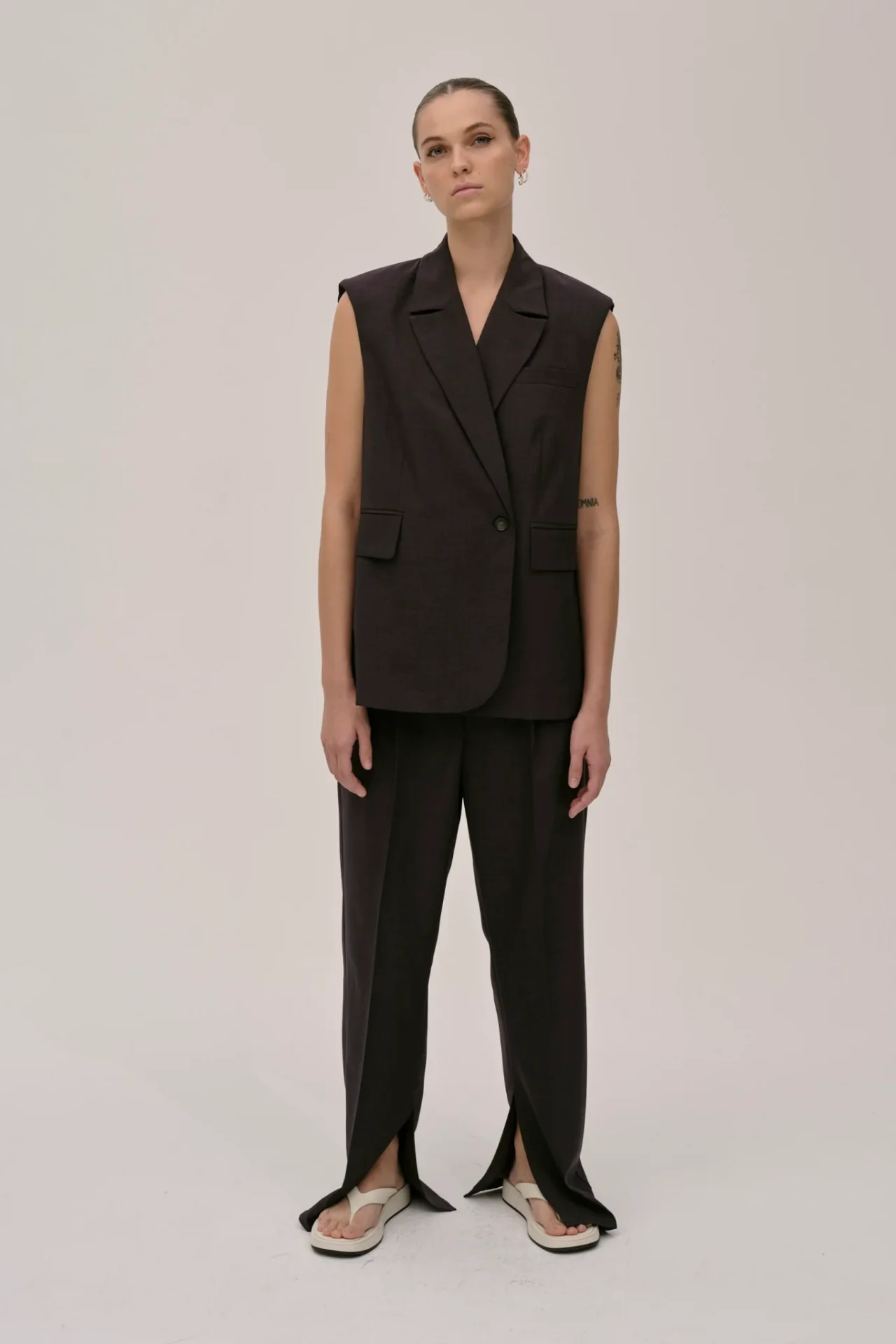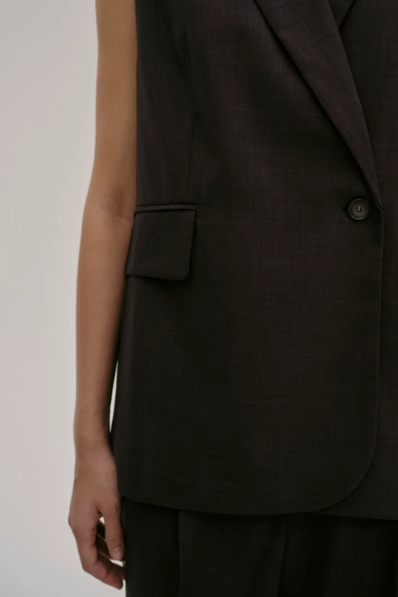 De Averill Blazer is een oversized mouwloze blazer met een ontwerp met dubbele rij knopen, een enkele knoopsluiting, schoudervulling voor een klassieke blazerlook en zijpanelen.