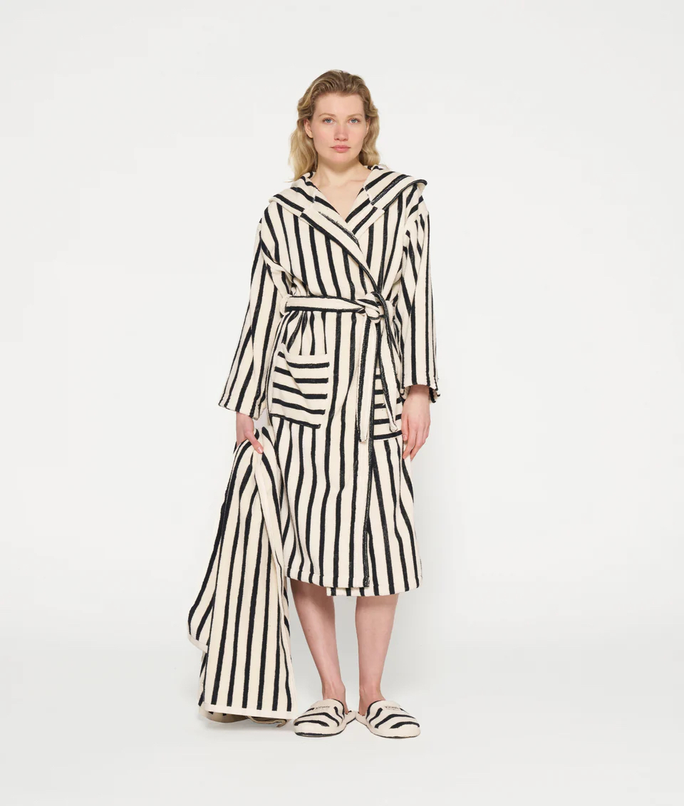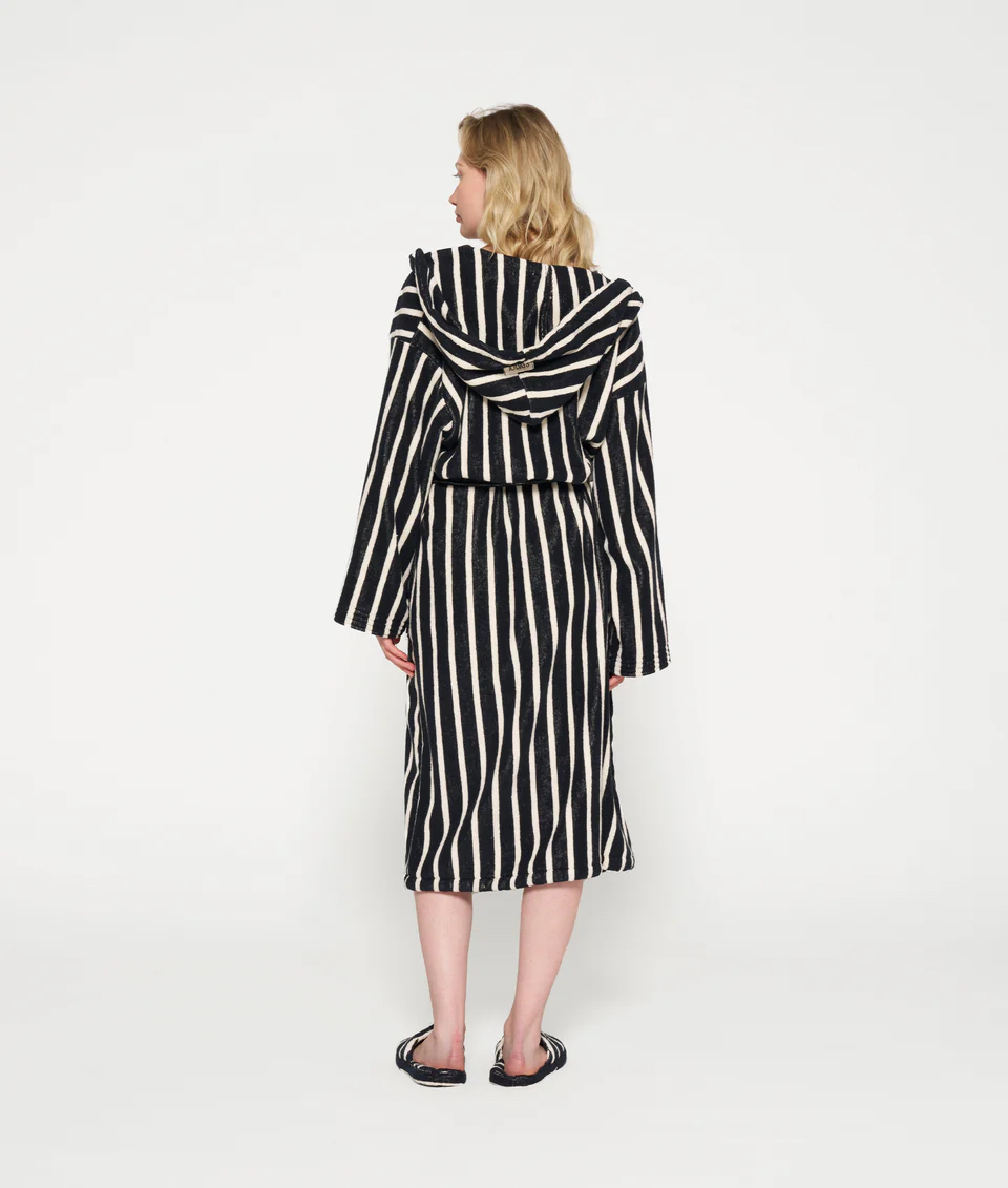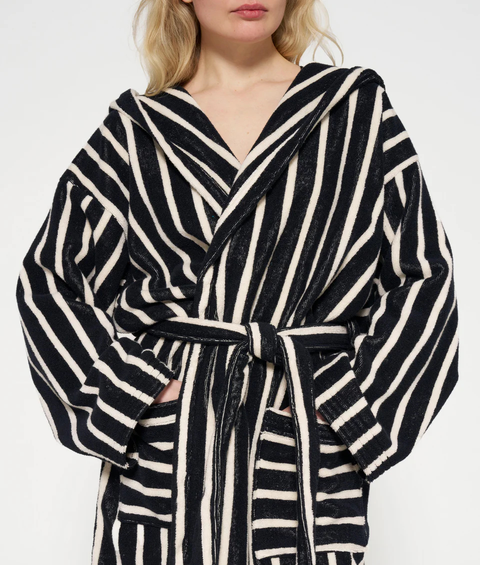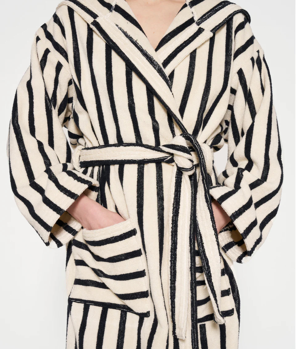 Badjas met streepdessin van 100% GOTS gecertificeerd biologisch katoenen badstof. Voorzien van een capuchon met canvas 10DAYS label, een ceintuur, opgestikte zakken en een handige haaklus aan de binnenzijde.