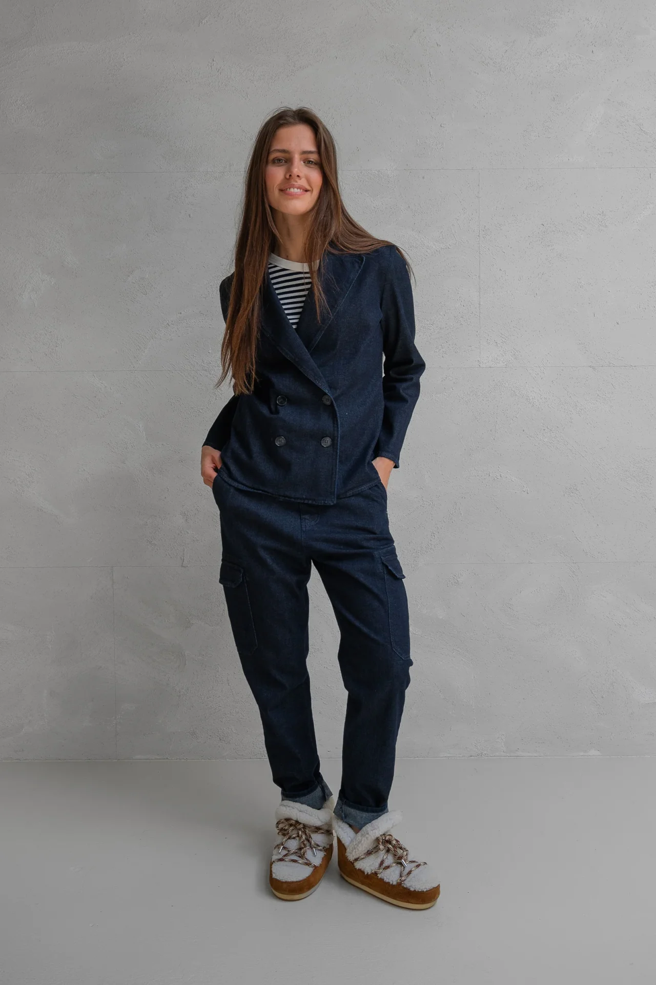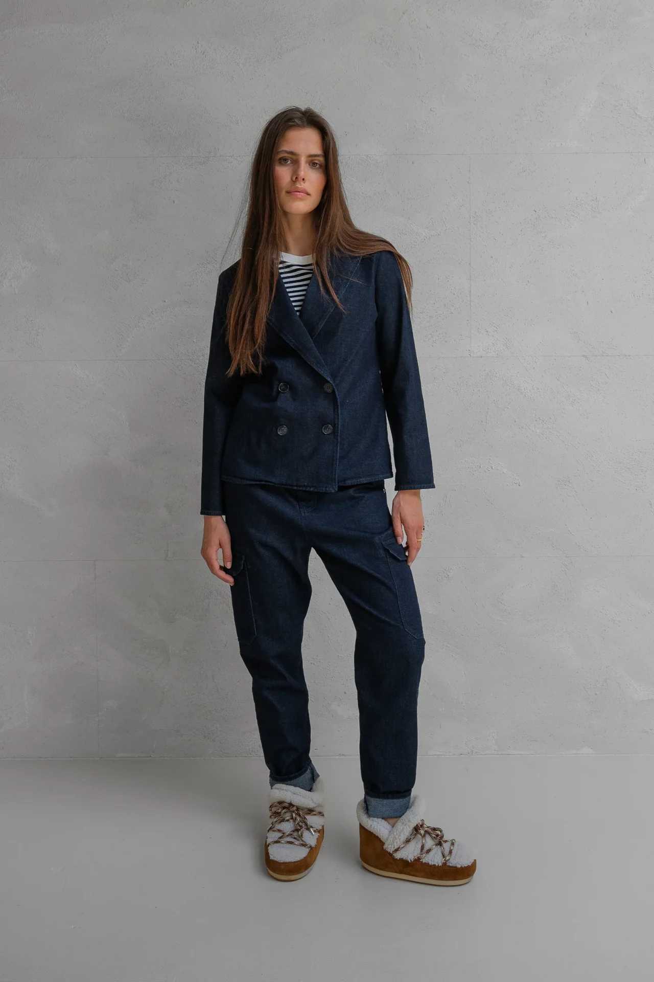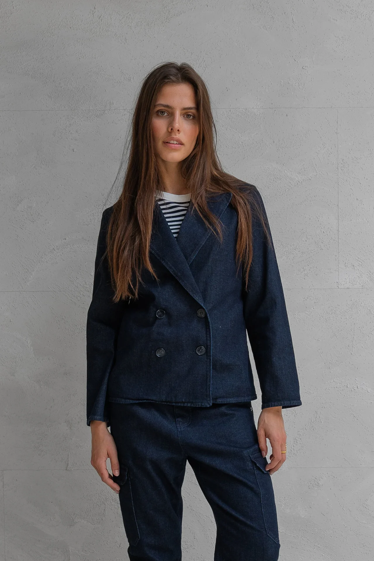 Til je garderobe naar een hoger niveau met deze moeiteloos chique donkerblauwe blazer met jeanslook. Ontworpen met een modern silhouet met dubbele rij knopen en een verfijnde denimtextuur, vindt het de perfecte balans tussen ontspannen en op maat gemaakt.