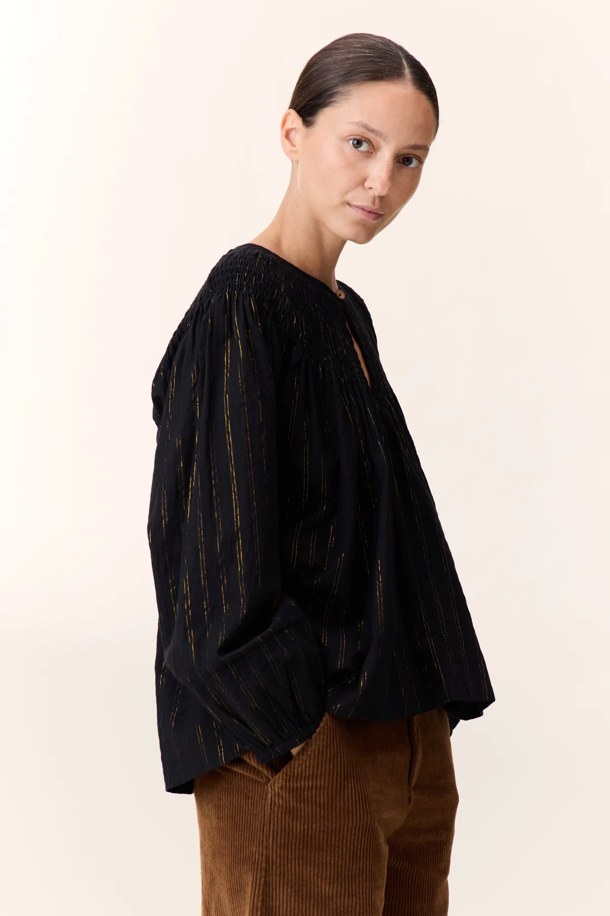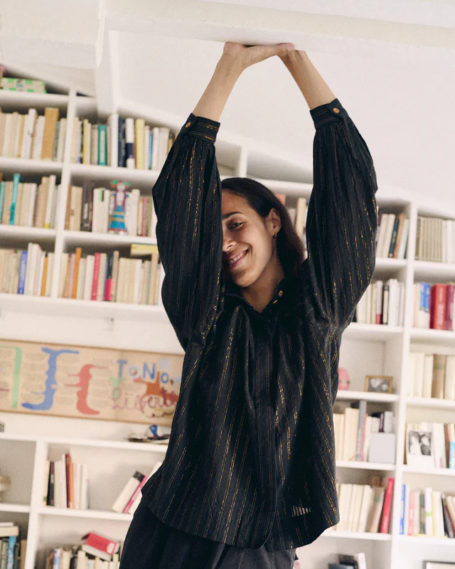 De Choumi Strp-blouse valt op met smocking op de buste, die een vloeiende textuur en een luchtig silhouet onthult dat kenmerkend is voor het Leon & Harper-universum. De lange, losse mouwen afgewerkt met getailleerde manchetten creëren een zachte maar gestructureerde lijn. Verticale strepen accentueren het stuk en voegen een subtiel grafisch ritme toe, terwijl een ronde halslijn zich opent in een druppelvorm die wordt gesloten met een delicate knoop. Ideaal gecombineerd met een rechte broek of een midi-rok voor een evenwichtige look.