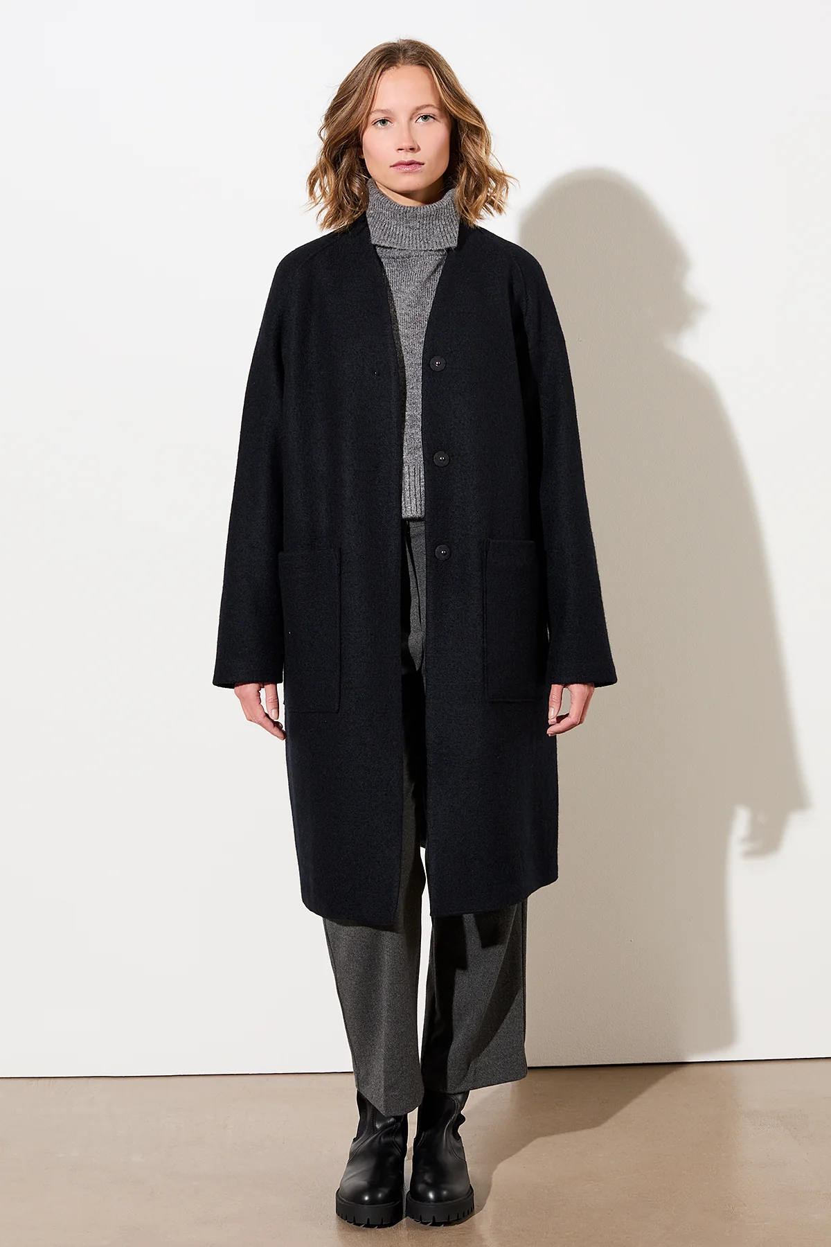 Deze knielange jas van 100% biologische wol is even minimalistisch als elegant. De kraagloze halslijn en de verborgen drukknoopsluiting stralen subtiele elegantie uit. De twee grote opgestikte zakken zijn een echte blikvanger.
