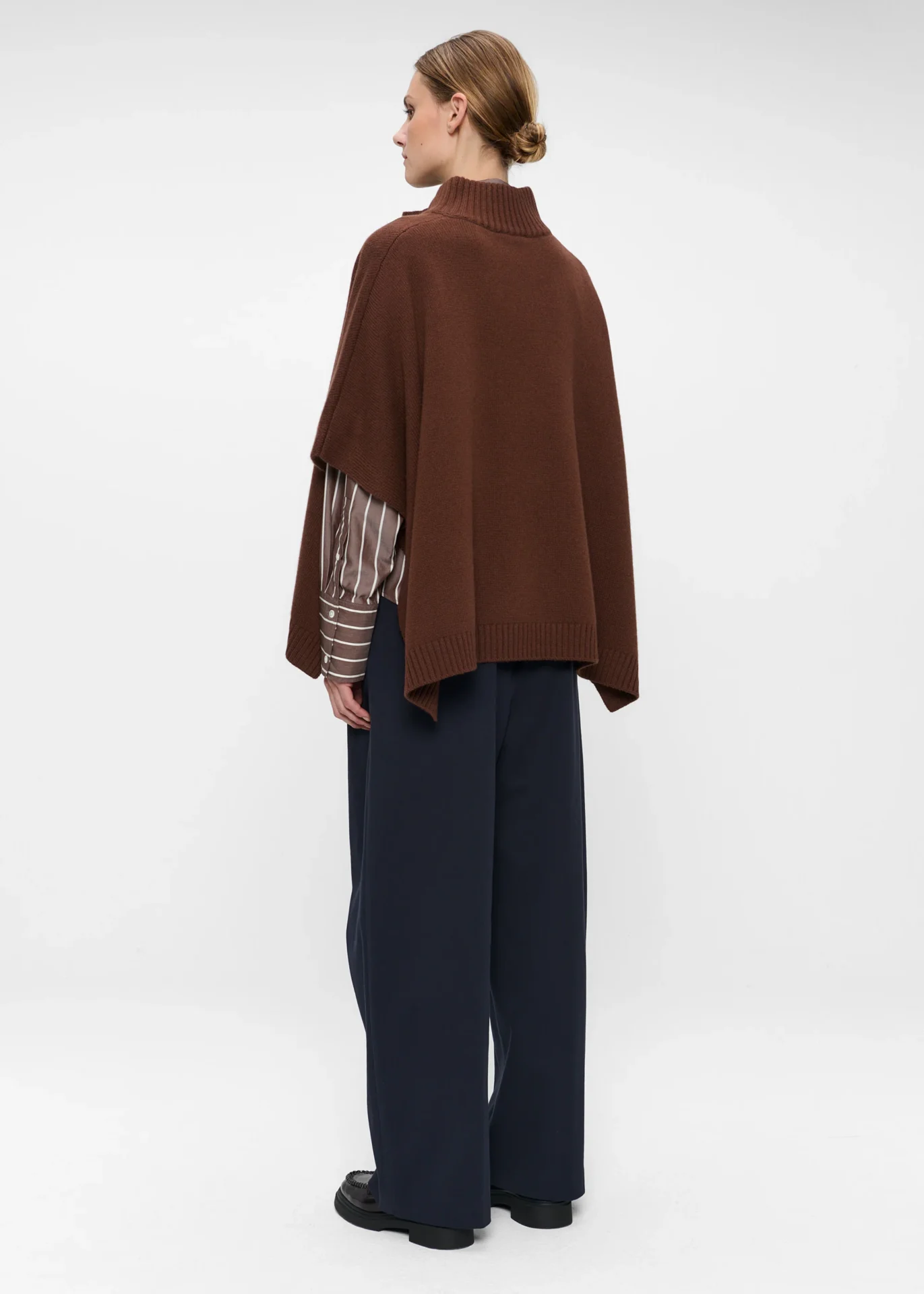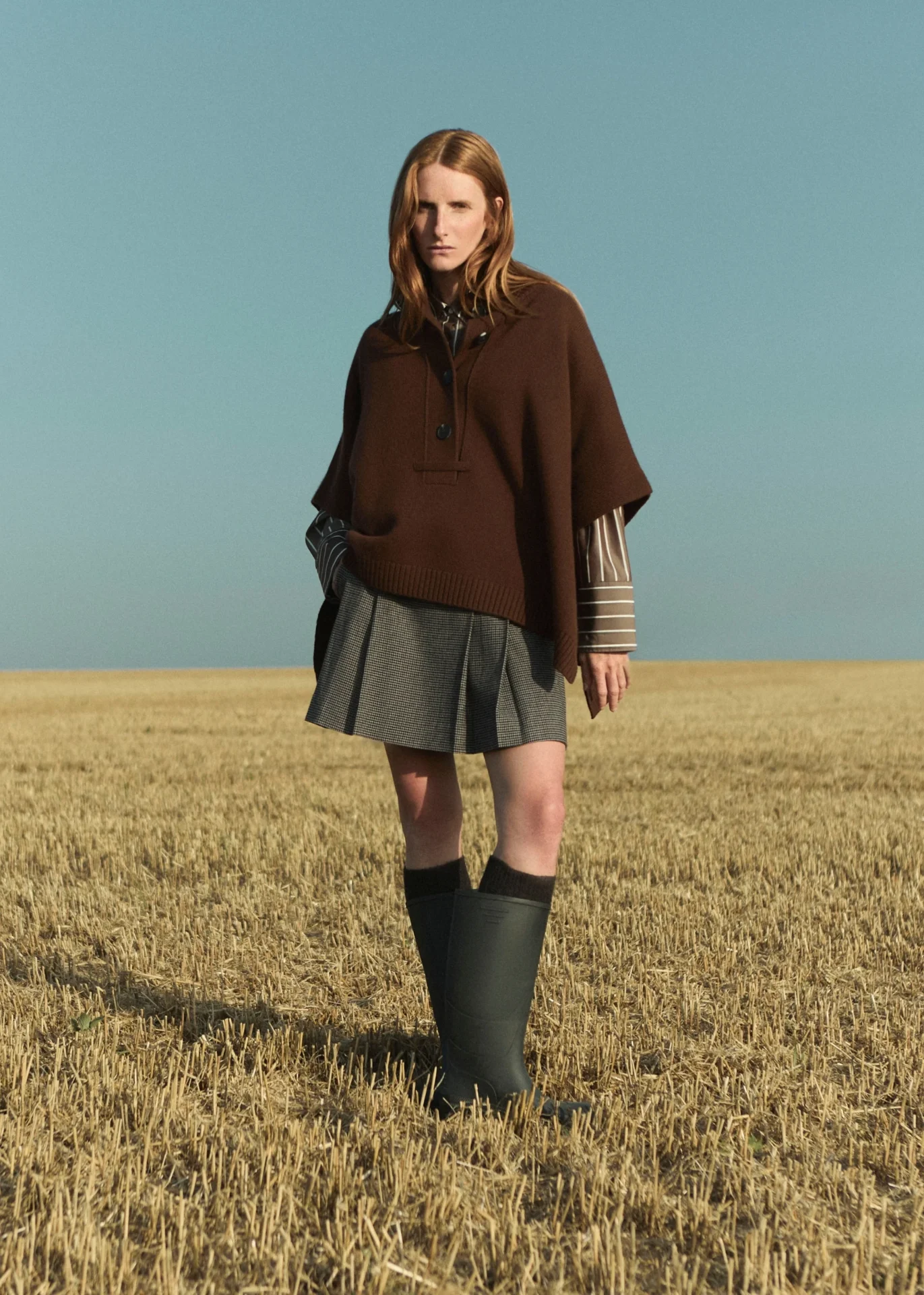 Een zachte poncho van lamswol, die verkrijgbaar is in twee maten. Een wijder silhouet met trechterhals en knoopsluiting aan de voorkant. Een gemakkelijk kledingstuk dat kan worden gedragen als extra laagje.