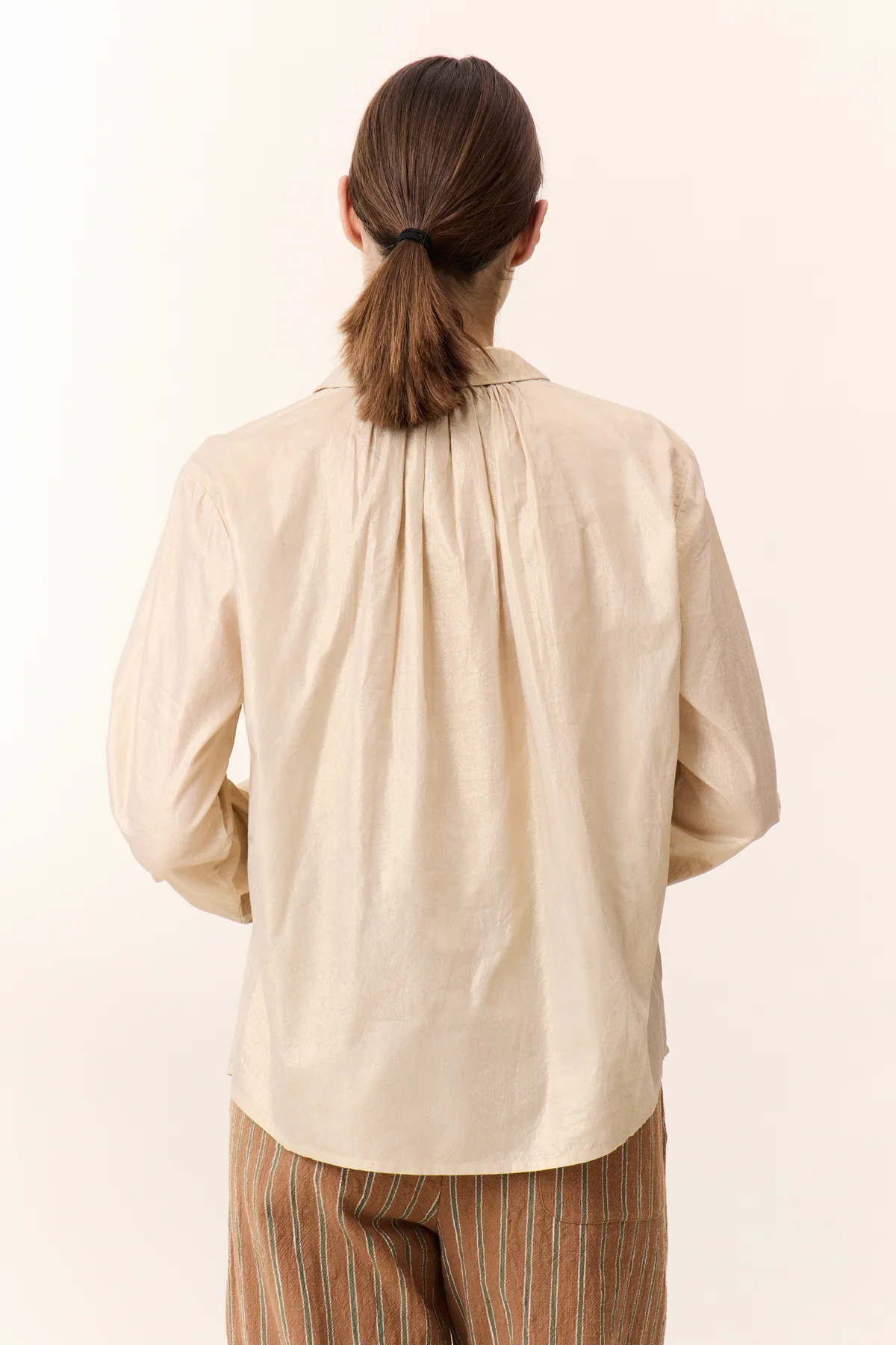 Licht en licht, het Cob Foil overhemd is de perfecte bondgenoot om je garderobe op te fleuren met zijn glanzende stof. De lichte ruches bij de kraag en de vloeiende pasvorm geven je outfits een vleugje bohemien. Het wordt gecombineerd met een lichte jeans voor een frisse en elegante look die comfort en verfijning combineert voor zonnige dagen met stijl.