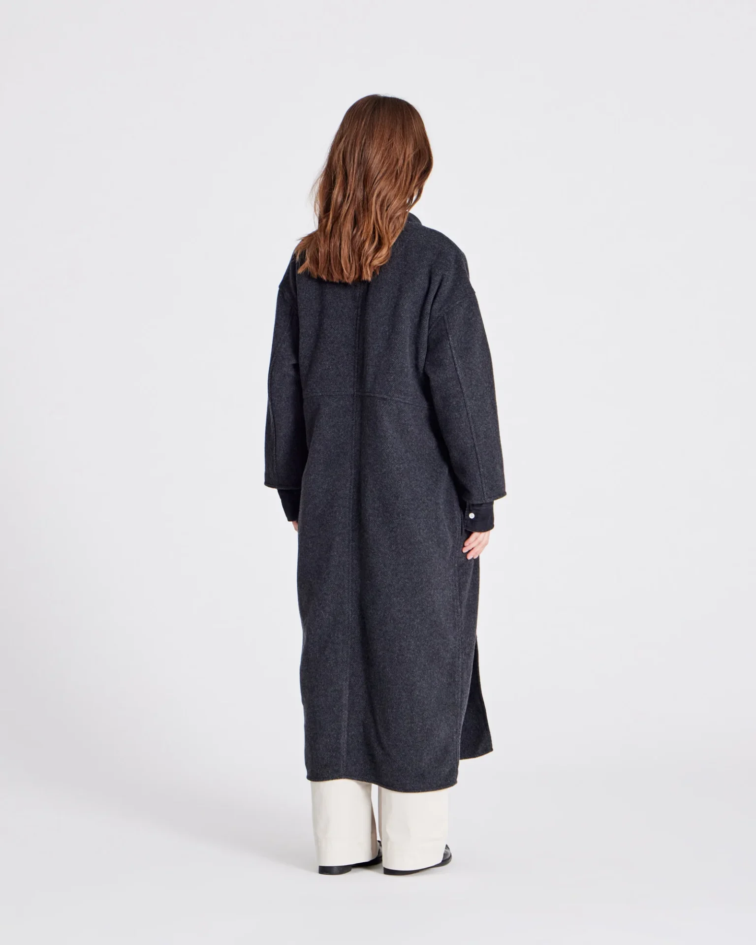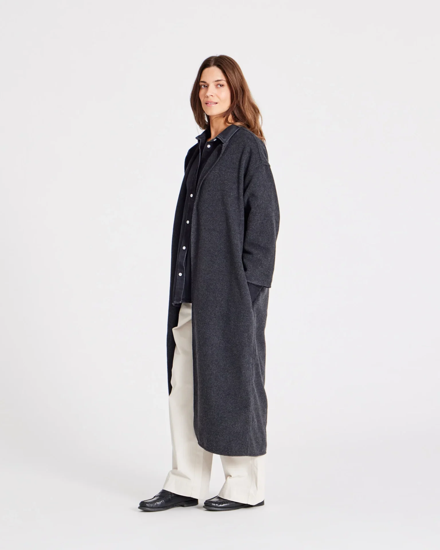 Flora Jacket is een longline jas gemaakt van 100% gerecyclede wol. De jas heeft een lage schoudernaad en zichtbare stiksels op de rug. Flora kan open of gesloten worden gedragen met een stropdasriem.