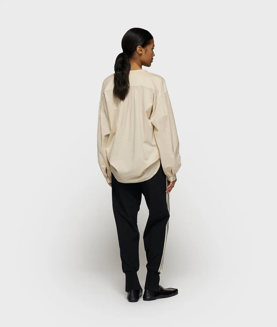 Oversized fit blouse van katoenen Ibiza voile met een rugpas en manchetten van licht gestructureerde jersey. Voorzien van een ronde hals met ribkraag, knoopsluiting en gatheringdetails aan de schouder, borst en rug. Afgewerkt met een geborduurd monogram op de linkermouw, plooien boven de manchetten en een afgeronde onderzoom.