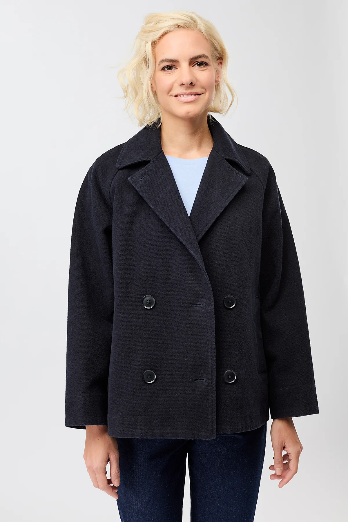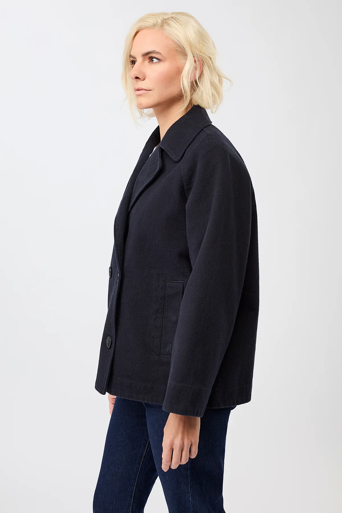 De sportieve paspelzakken kunnen met een drukknoop worden gesloten. Functionele extra’s zijn de binnenzak met rits en de ventilatiegaatjes onder de armen. Opvallend mooi zijn de dubbele rij tinnen knopen met logo-gravure.