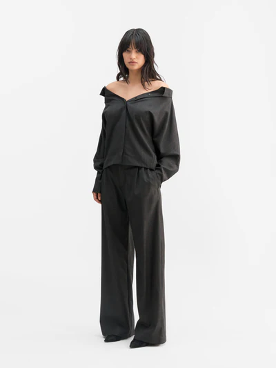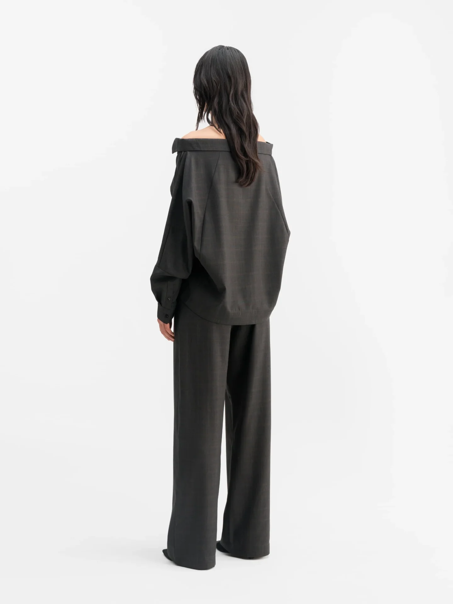 Mel-broeken zijn gesneden uit een wolmix met een geruite jacquardpatroon. Ze hebben een middentaile en een ontspannen been. Ze hebben zakken in de zijnaad, de vliegen en de riemlussen.