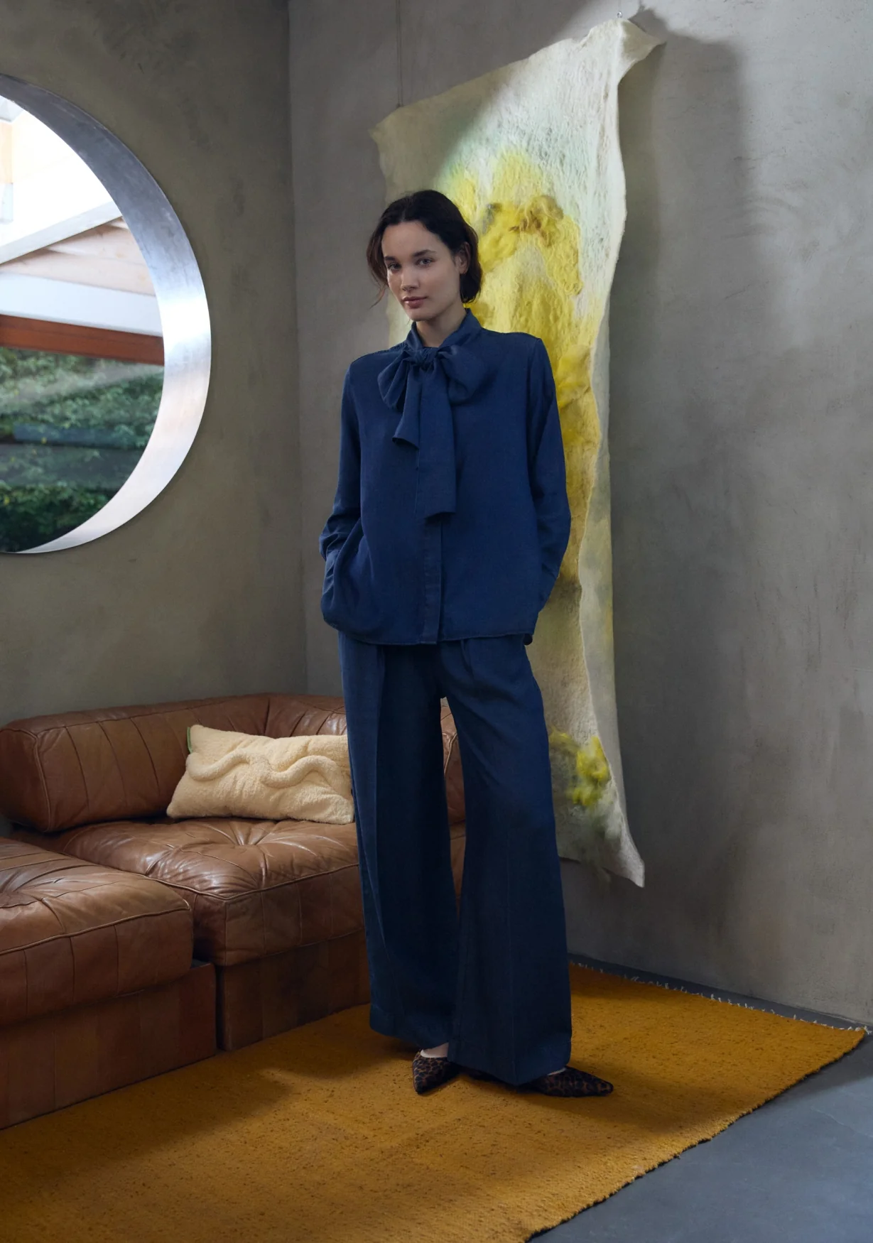 Soepel vallende bandplooibroek van Tencel denim met een wijde pijp en elegante plooi aan de voorkant. De elastische tailleband zorgt voor een comfortabele pasvorm zonder in te leveren op stijl. Gemaakt van Tencel – zacht, ademend en met een natuurlijke glans. Voor een perfecte fit adviseren we één maat groter dan je normaal draagt.