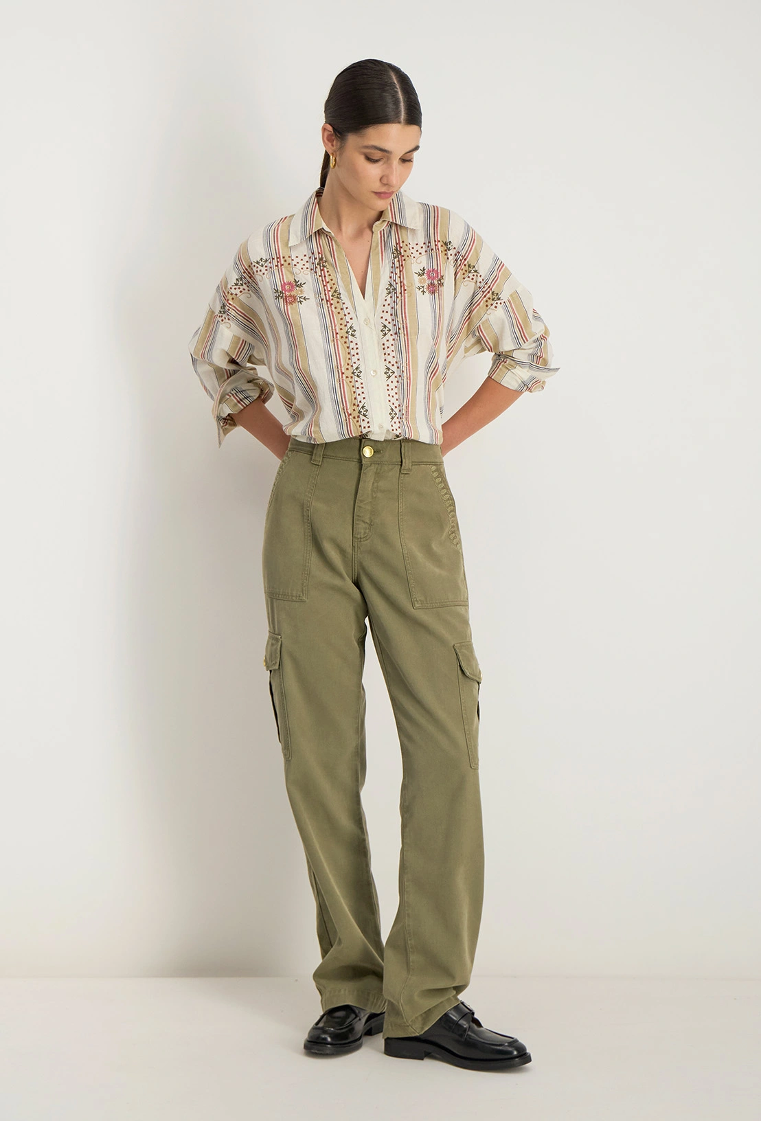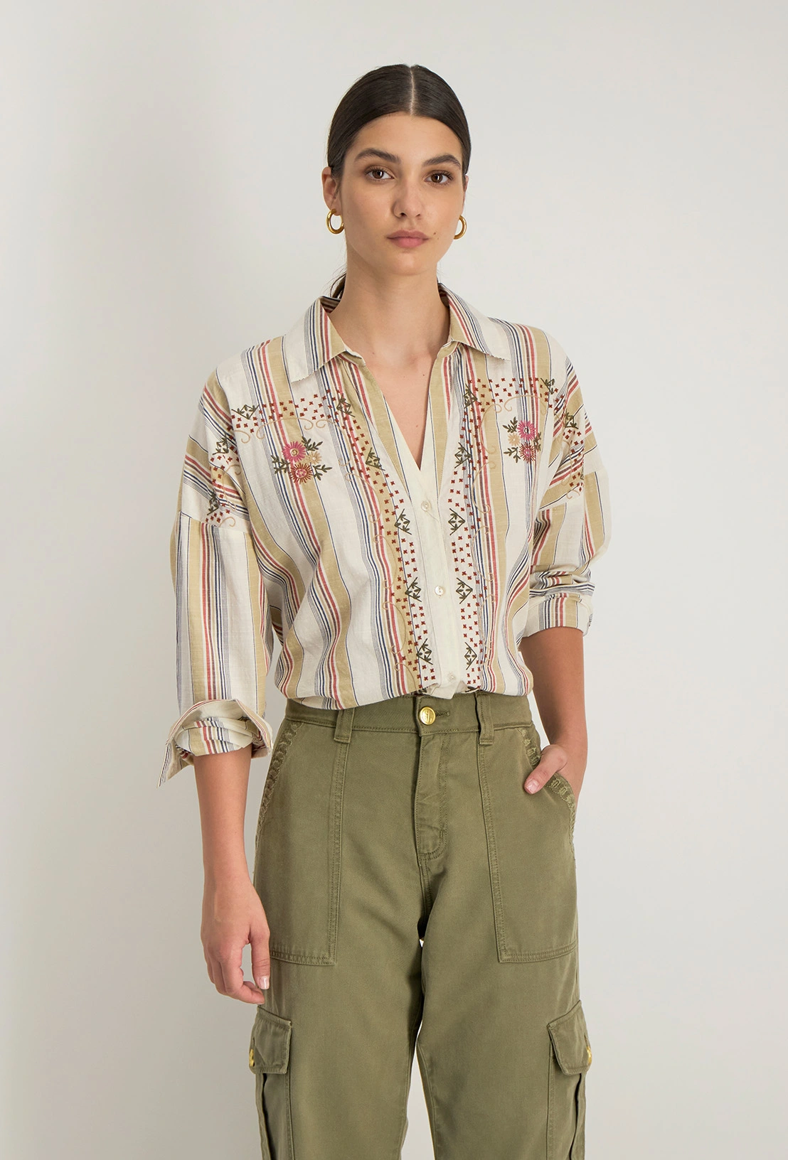 Het Solara-shirt is subtiel geborduurd en onthult Boheemse elegantie met zijn boxy snit en strepen op een uitgebreide stof, een waar kunstwerk.