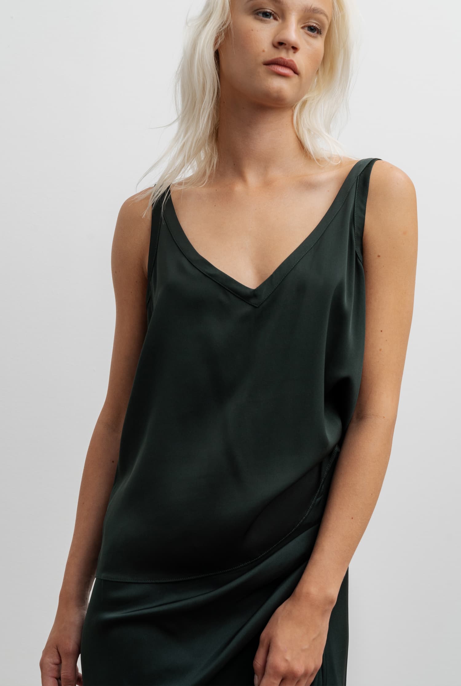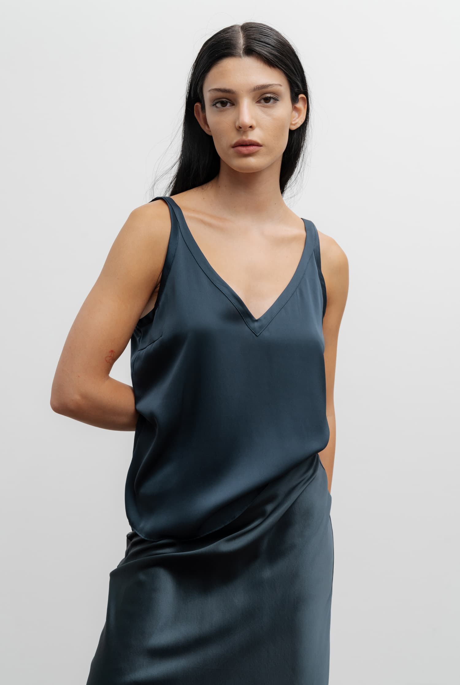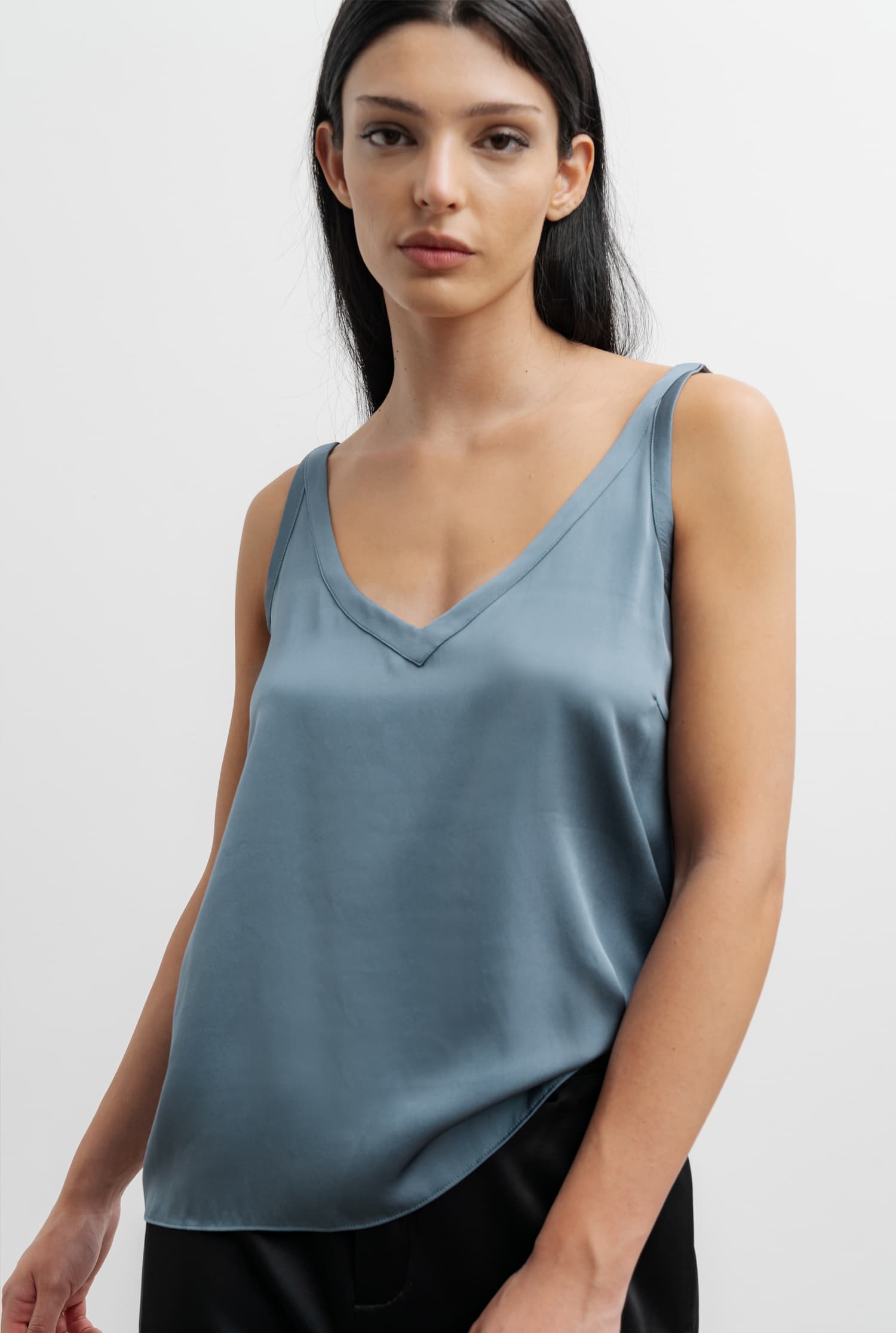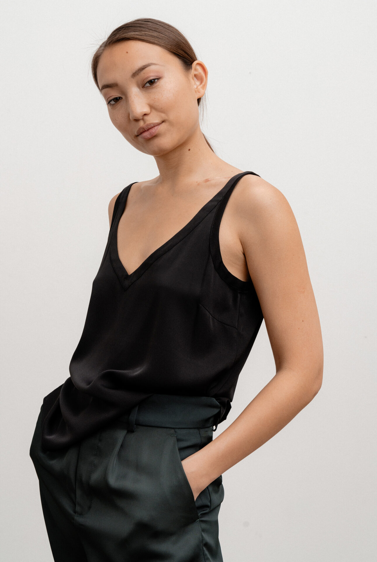 Shin tank is created in our most classic silk/stretch and features a deep V-neck at front neckline together with our signature embroidery seam along the spinal.