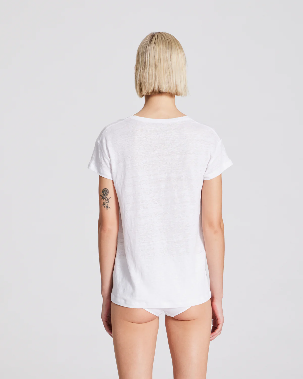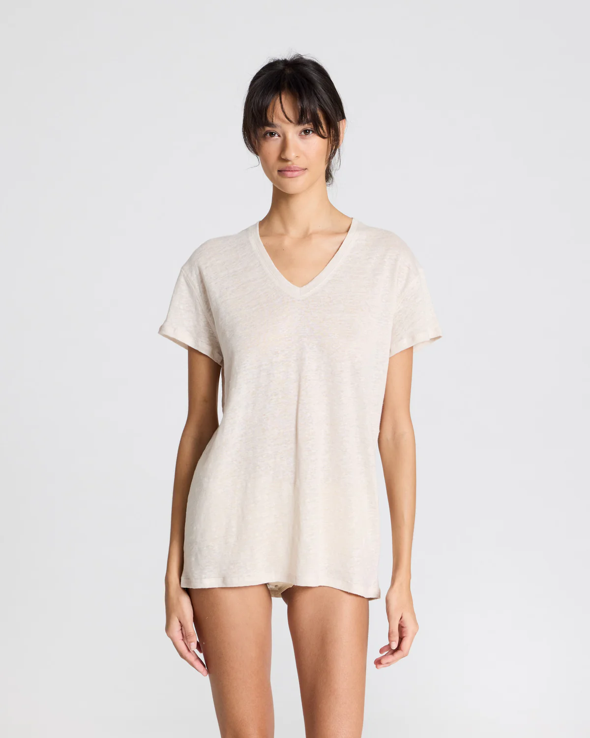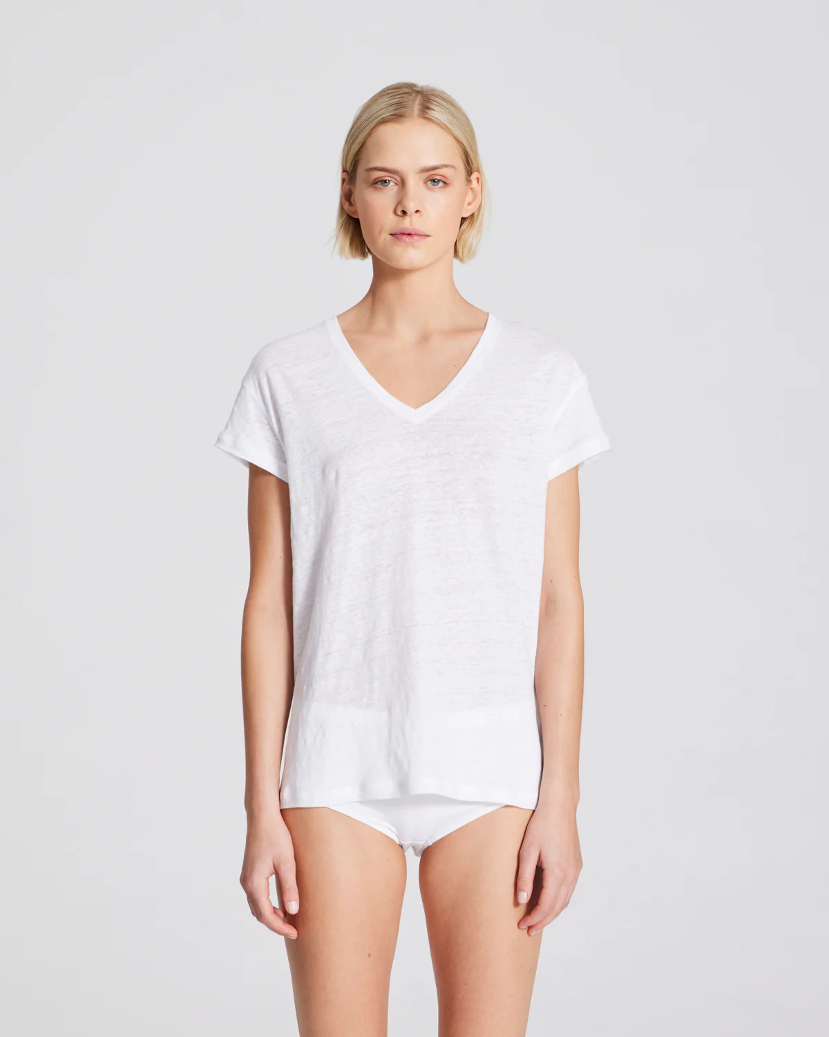 Simone is een T-shirt gemaakt van 100% linnen. Het T-shirt heeft korte mouwen, een v-hals en een relaxte pasvorm. De structuur van linnen maakt het T-shirt iets transparant, vooral de lichtere kleuren.