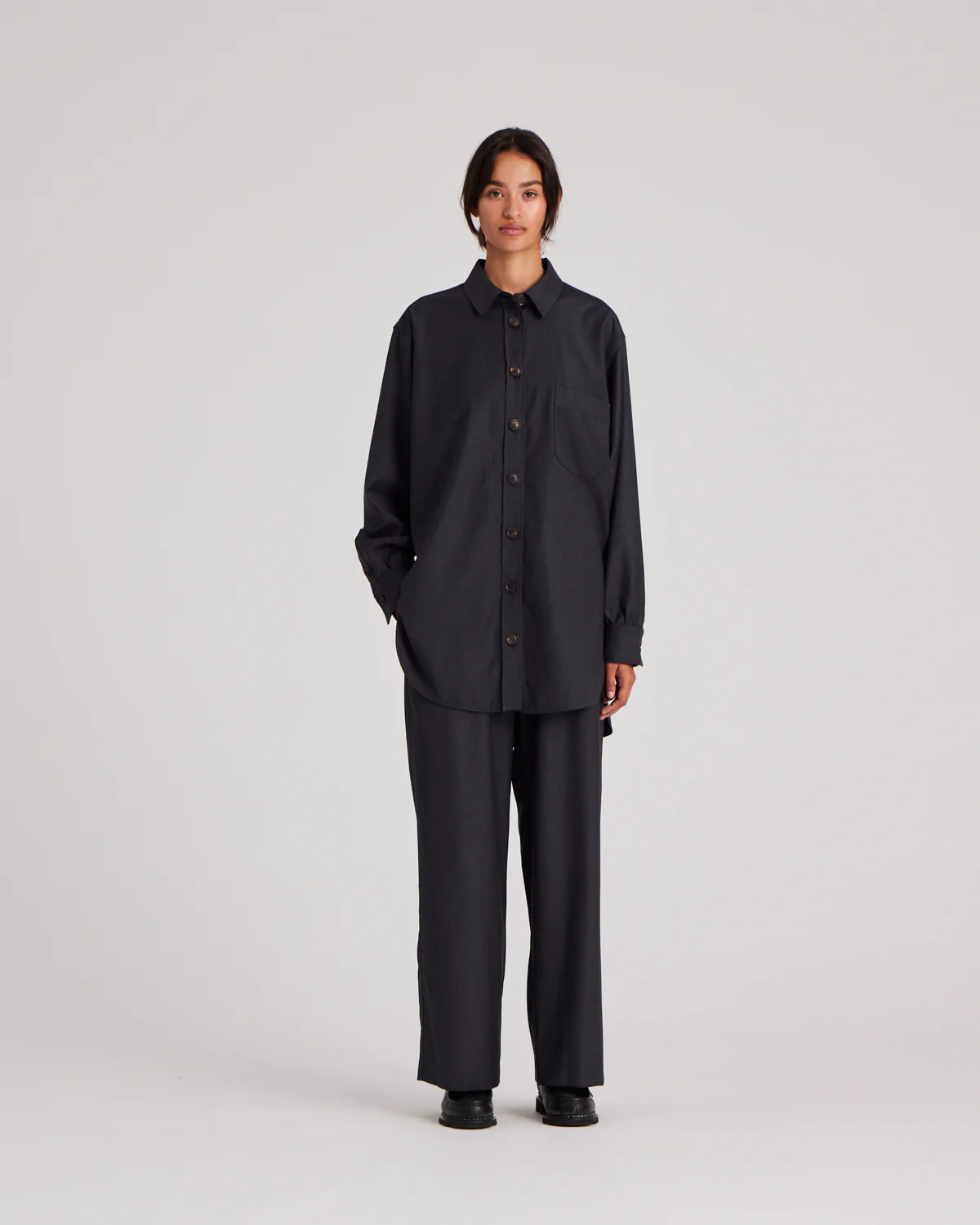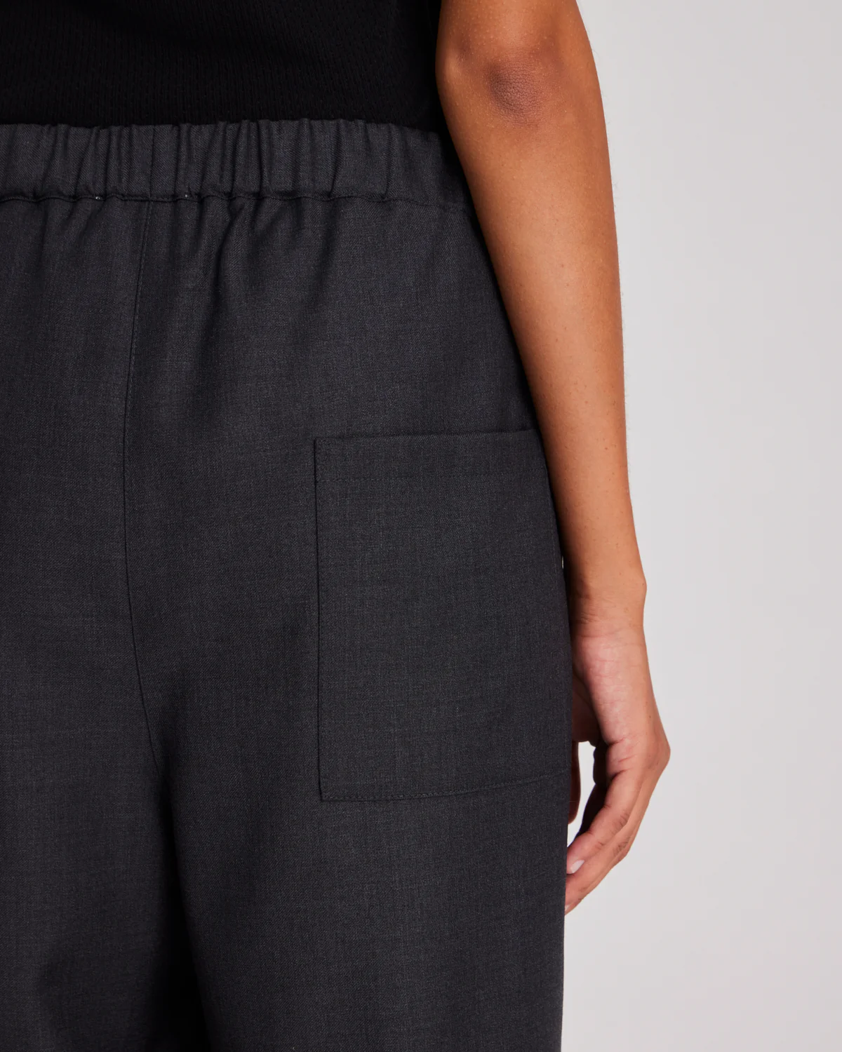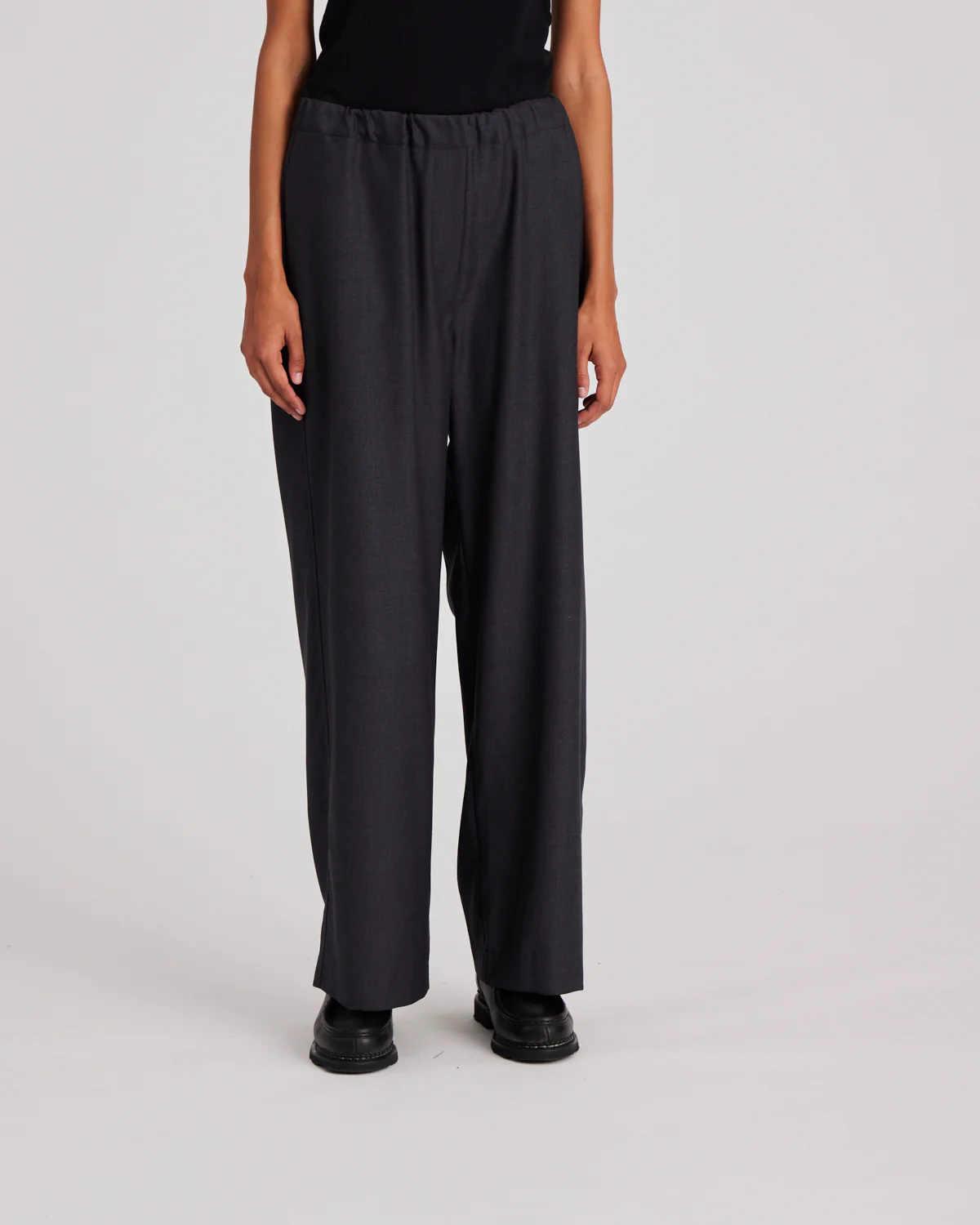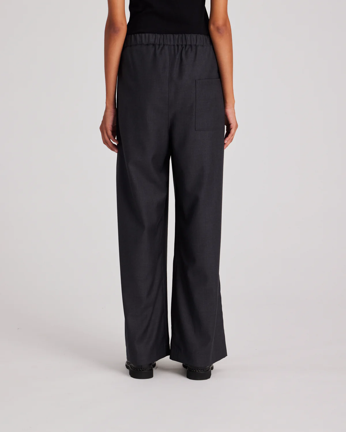 Thilde Wool Pant is een broek gemaakt van 80% wol en 20% nylon. De broek heeft een elastische tailleband en steekzakken. De broek heeft een nep-vliegen, een achterzak en rechte, brede pijpen. Thilde heeft een relaxte pasvorm.