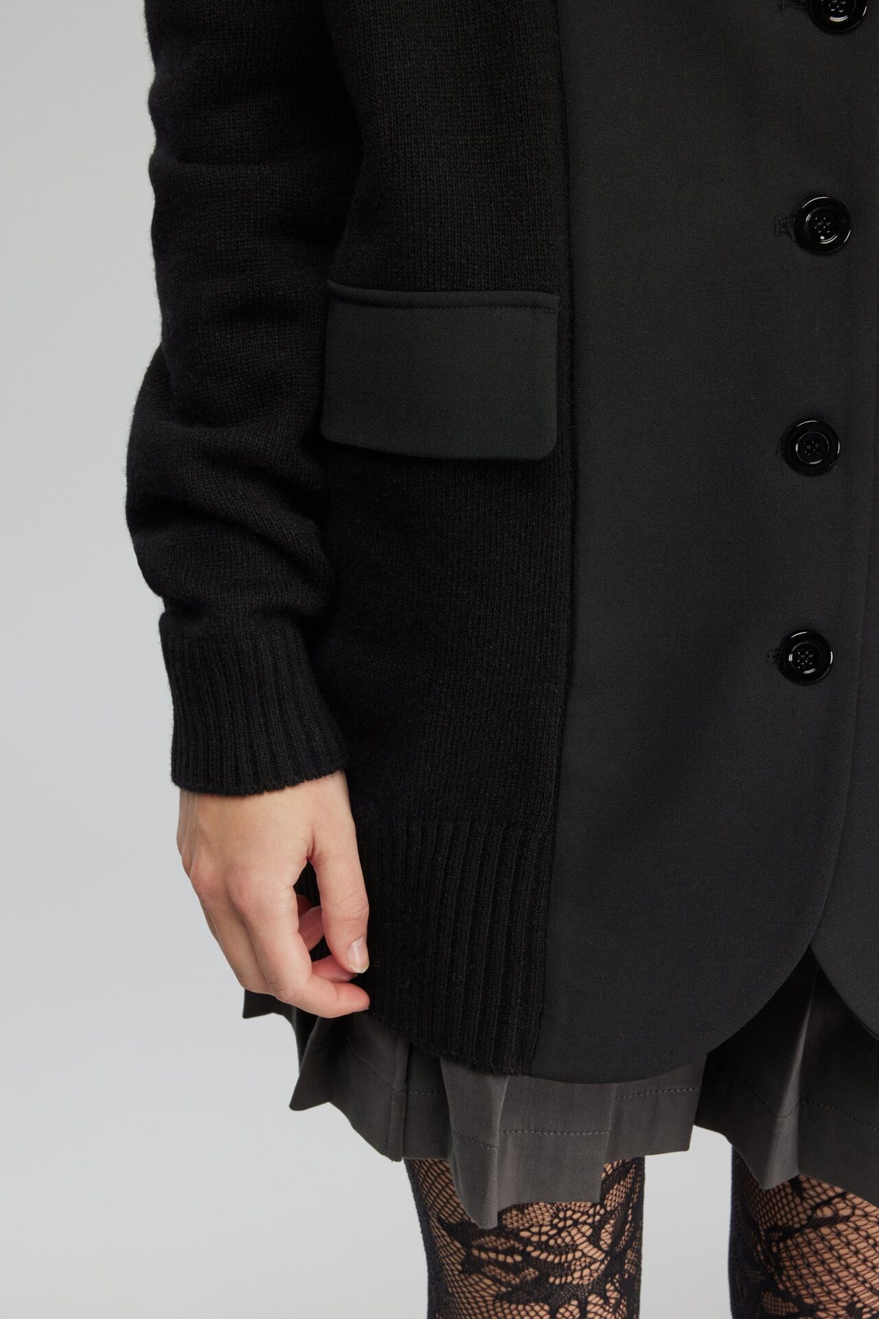 Een jasje van een wolmix. Model met revers, knoopknoop aan de voorkant, bekkenlengte. Normale kleding.